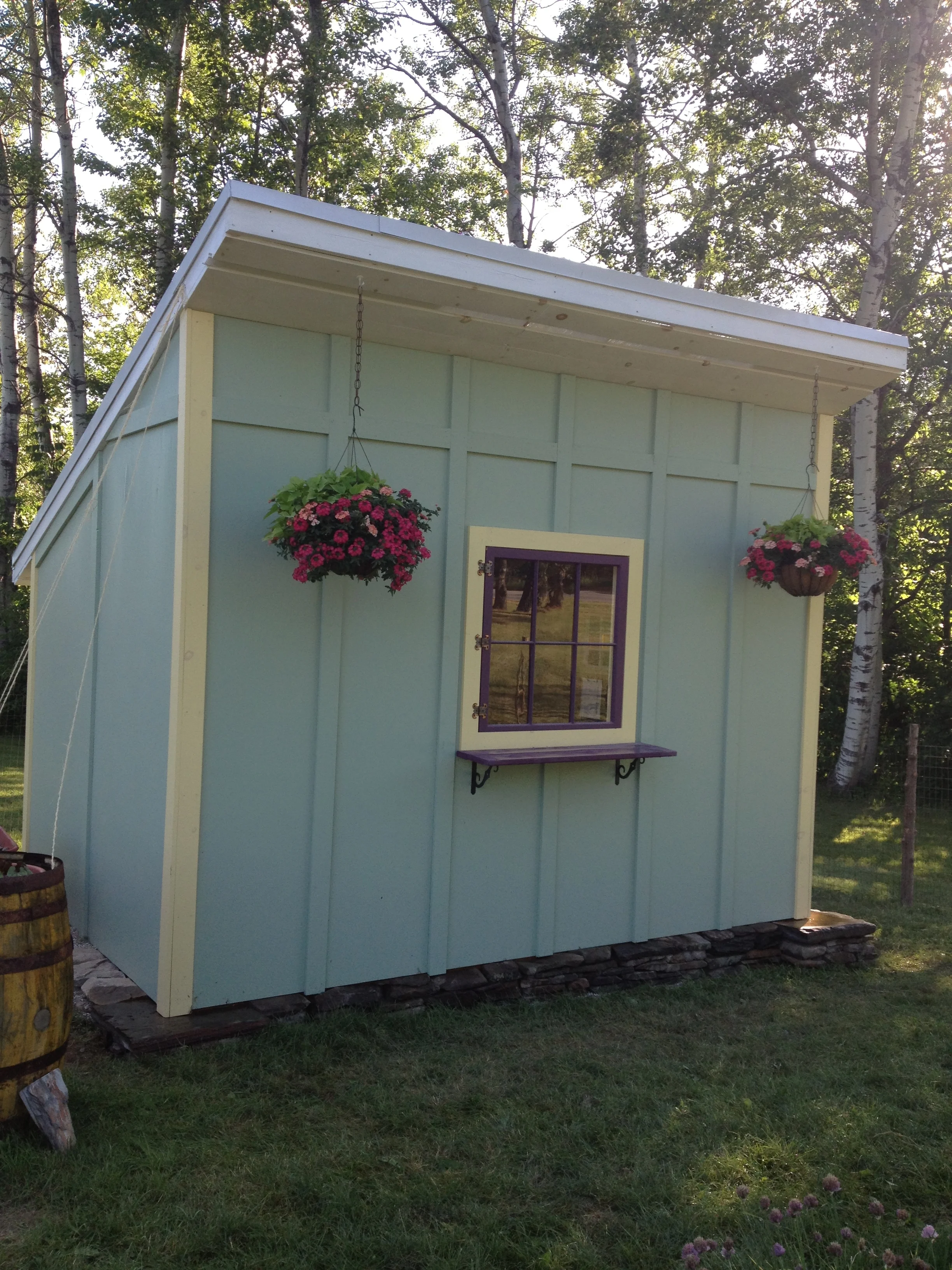 A labor of love over the years by many friends and family members, the shed is affectionately referenced by my neighbors at the country store. Most wonder where the chickens are because they were convinced we were building a coop by the shape. The door is from a 1934 farmhouse and has a dimension that changes with the weather. The stained glass window took 11 hours to refinish coming from a local architectural salvage warehouse. The center ceiling panels are transparent for seed starts in the spring. The doorknob cost more than the lumber and the front stone step landed there via toboggan. I have big plans for a rainwater collection system feeding a sink made out of an antique maple syrup strainer to be installed on an 8' piece of barn board. Coming in 2015!